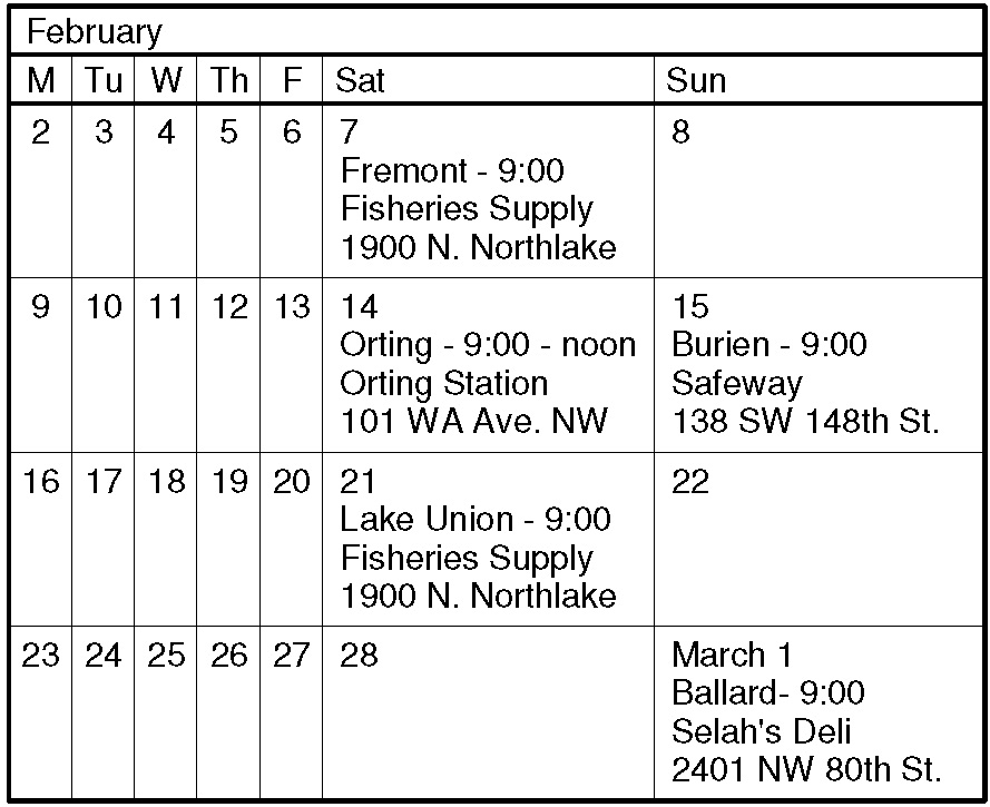 Sat. Feb. 21. Lake Union. Meet at 9:00 a.m. at Fisheries Supply at 1900 N. Northlake Way, Seattle (note: store actually fronts on N. 34th St). Host: Dorothy Gesick. 11K route, rated 1A. For full details about the walk, including public transit options to the start location, click on Lake Union. Registration for this walk is only through the physical start box, available at the start location. All walkers shall register and pay $4 registration fee.